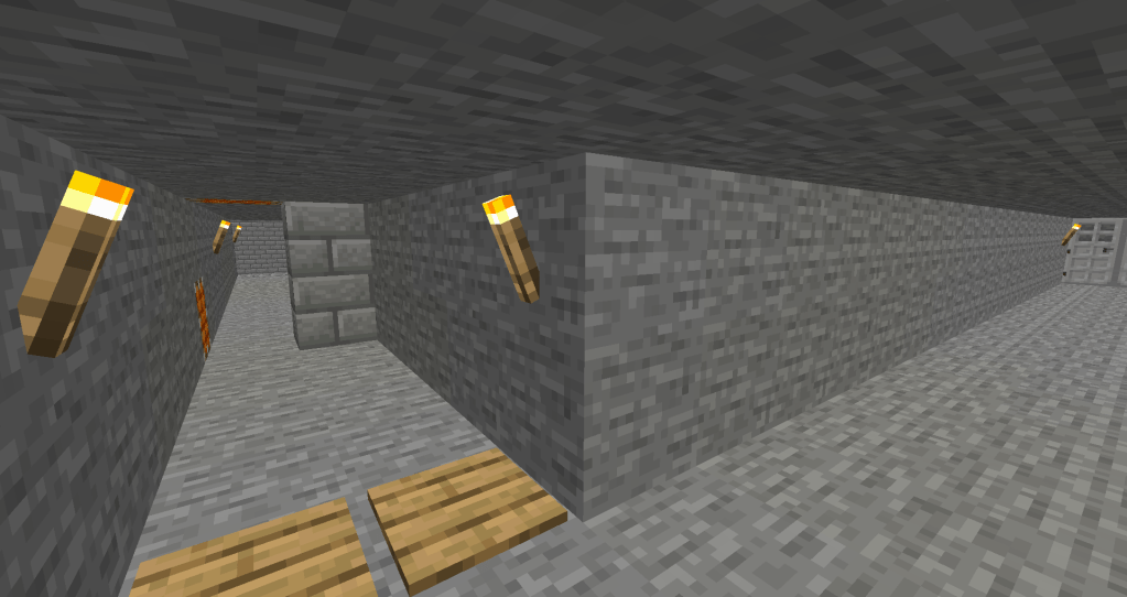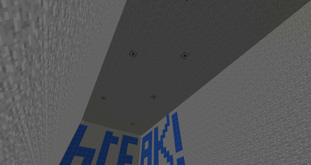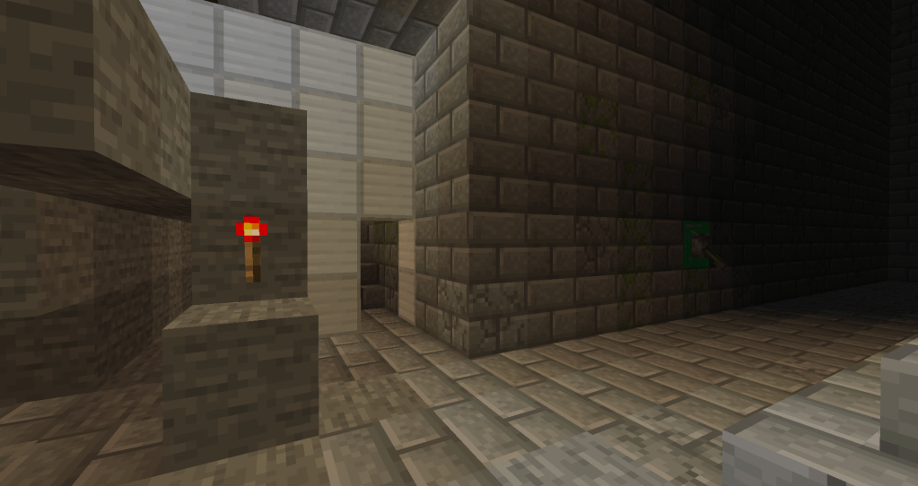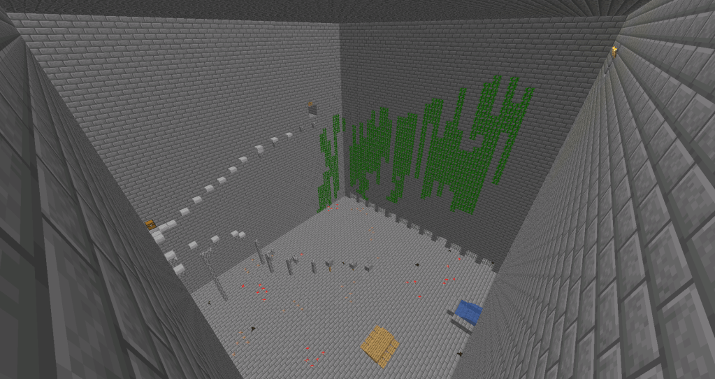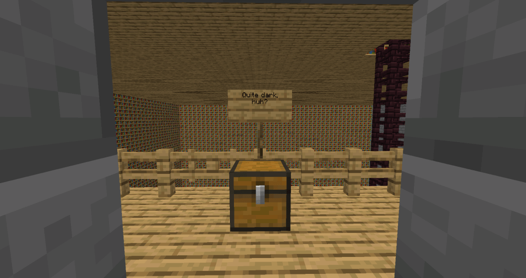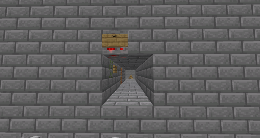 The prison room… Why was it so large??? I remember I gave up on placing vines since it could be used to skip the parkour… Not to mention my brilliant exit sign, it glows red sometimes because redstone ore…