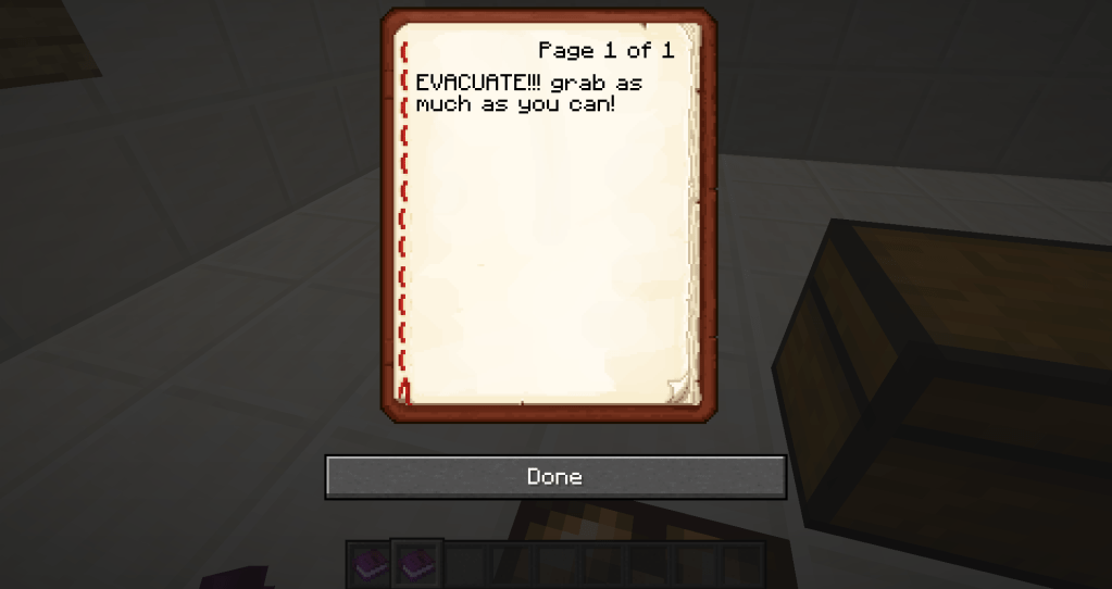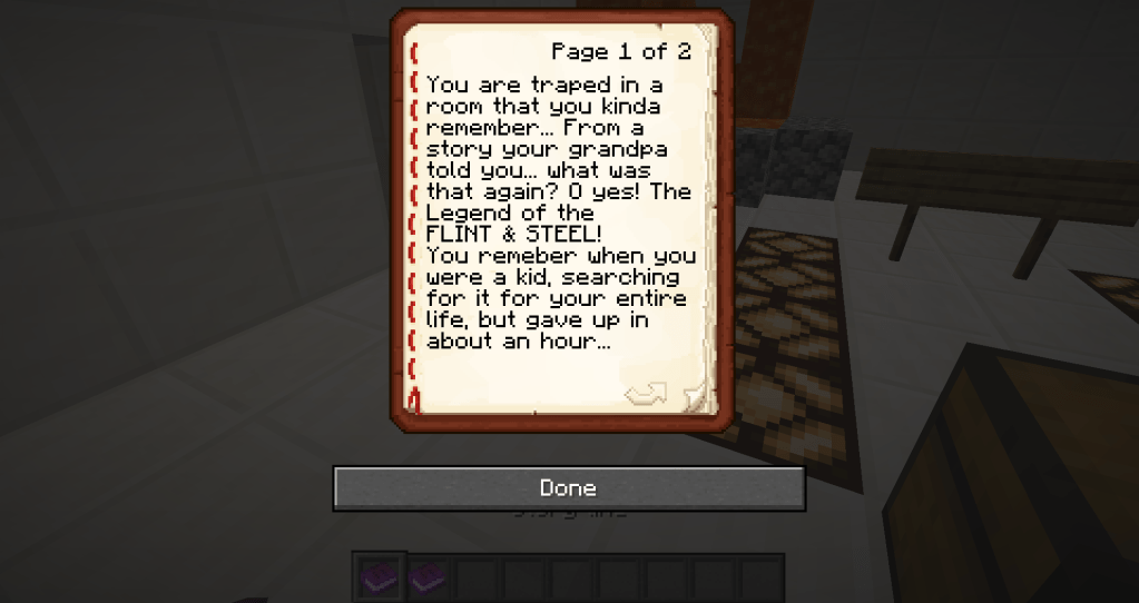 The plot brings me to tears… (You were given the flint item which was enchanted with Unbreaking.255, the item was gone on this copy. Your goal was to find the steel I guess, then… what did I think would happen? You would just end up with regular flint and steel, I wasn’t advanced enough to do anything more haha.)