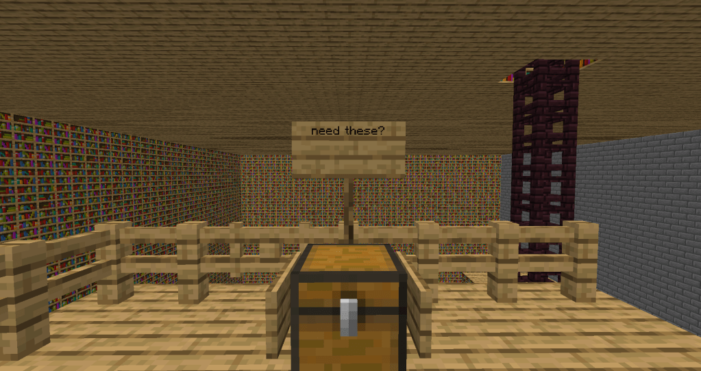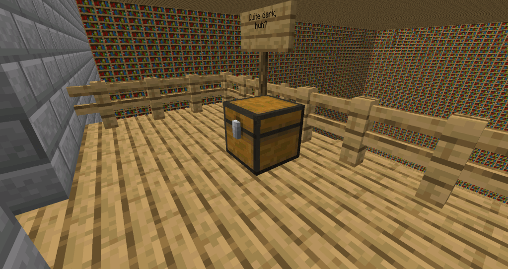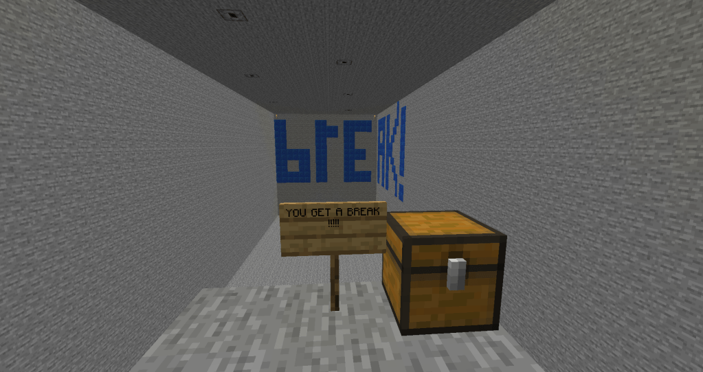Exausted after a few minutes of running through 3 big rooms? Here’s a break room I guess! (By the sign you could tell my redstone was flawless!)