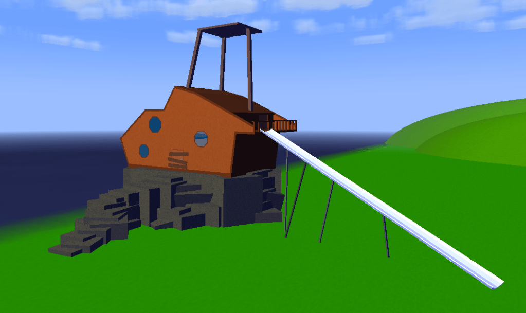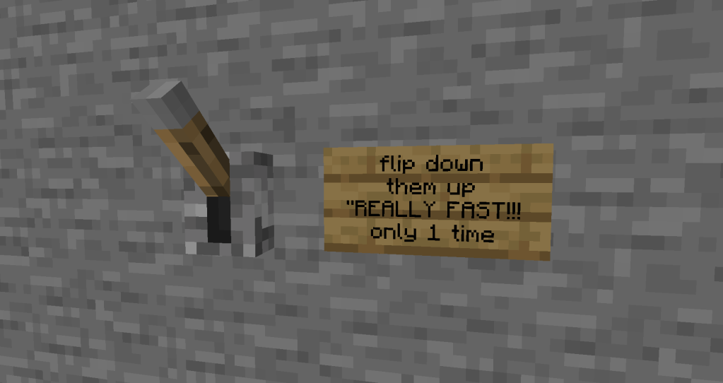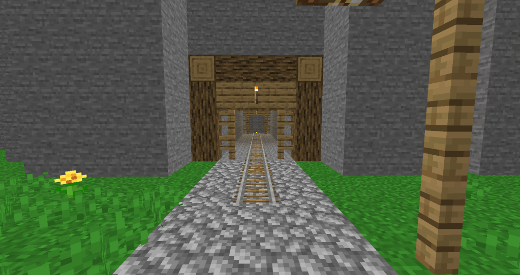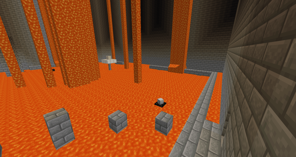 You exit the tunnel, this isn’t your house! This must of been a glitch… this strange tunnel somehow linking your mine to the door of this odd place… After some pillar parkour, you find a lever, and place it on the green block!