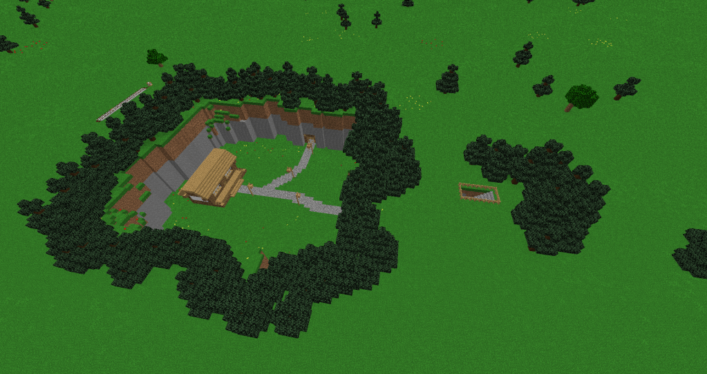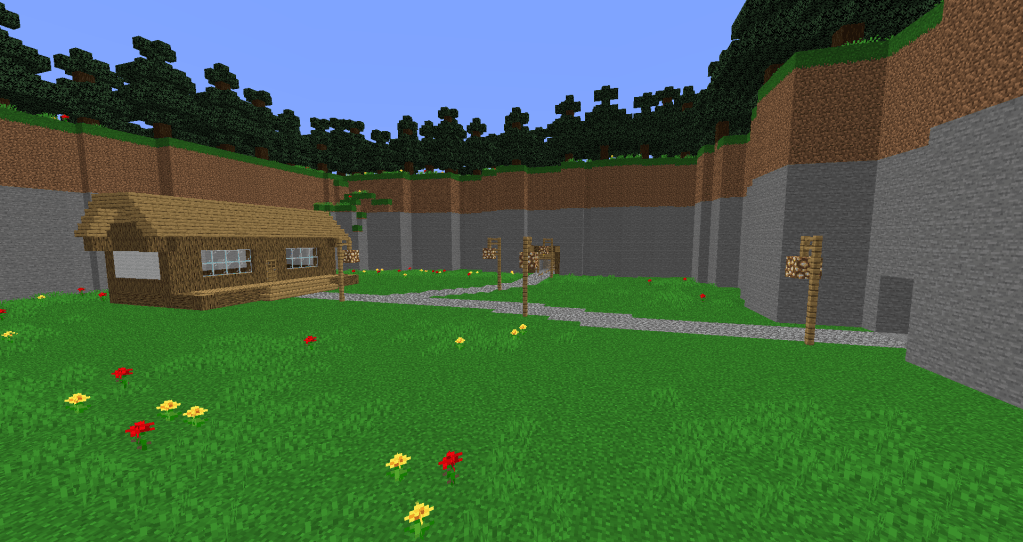 The little fence area had an invincible villager with some trades, I forget what they were. The dispensers however dropped some supplies, one being a powerful axe!… For some reason? This was 1.7…